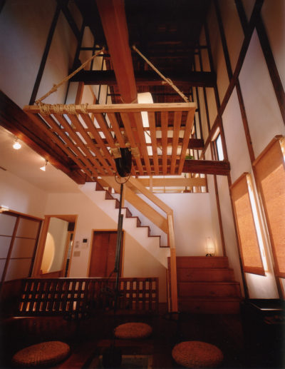 伝統工法では珍しい吹抜けの美しい梁をそのまま残し、その空間を利用して土間に床を設け囲炉裏を掘った。